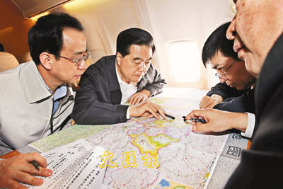■胡錦濤16日乘飛機抵達四川綿陽,慰問災區幹部群眾。總理溫家寶到機場迎接胡錦濤。 新華社