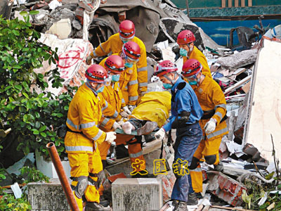 ■香港特區搜救隊在瓦礫中抬出一具屍體。