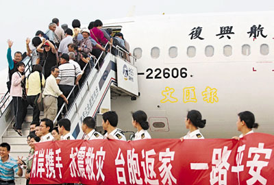 據了解,為了幫助滯川的台灣遊客盡快離開災區,15日下午,大陸民用航空局在收到申請的短短幾個小時內就批准台灣中華、長榮、復興航空公司的客運包機申請,並主動提出免除有關民航業務收費。而台灣方面也作出相應配合,對於直飛大陸的包機所需費用由台灣交通部承擔,台灣民航局保證會支付航空公司費用。