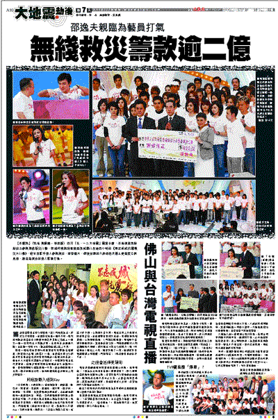 【本報訊】(記者 黃佩麗、李思穎)四川「五.一二大地震」震驚全國,本港演藝界紛紛出力參與籌款賑災行動,無線昨晚假將軍澳電視城舉行長達四小時的《眾志成城抗震救災大行動》,逾半百歌手藝人參與演出,陣容龐大,病後初癒的六叔邵逸夫爵士更首度公開亮相,親自為演出的藝人歌星打氣。