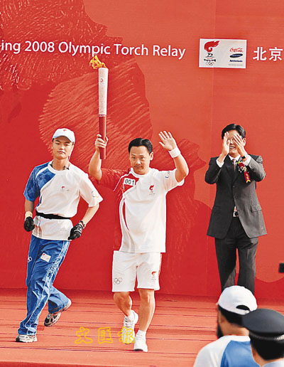 ■奧運舉重冠軍占旭剛傳遞浙江聖火第一棒。 本報記者張文 攝