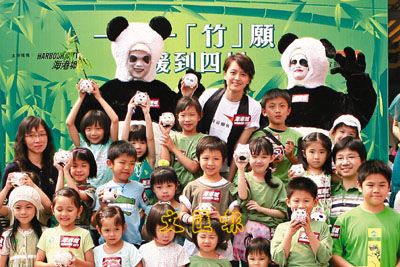 【本報訊】身為宣明會大使的梁詠琪(Gigi)前晚出席完無線的賑災活動後,昨日又往尖沙咀海港城,參與《一人一竹願,送暖到四川》的賑災活動,與近百位小朋友和家長一同設計慈善「熊貓錢罌」,義賣籌款(下圖)。