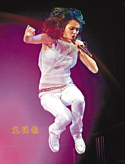 但凡是熱愛唱歌的人,只要情緒高漲都會激動得演出狂野,無論是十來歲少女抑或廿多歲適婚美人都沒有兩樣。所指是暫時變得低調的「迪士尼之寶」Miley Cyrus(上圖),前晚她於新澤西州東盧瑟福市的Izod Center參加Z100's Zootopia '08演唱會,突然凌空跳起台型十足,絕對及得上正為拉丁美洲有需要兒童而賣力獻唱籌款、擺動秀髮時誇張得凌亂四散的Shakira,可見兩女都唱得非常認真。■文:哈樂/圖:美聯社