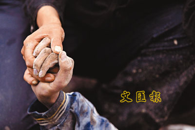 四川汶川大地震一名親屬緊握著一名遇難者灰白幼小的手,不忍離去……