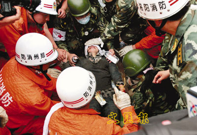 【本報訊】據中新社18日報道:廢墟下,一個人到底能堅持多久?汶川地震災區的生命奇跡在以令人難以想像的方式延續—最近1名倖存者汶川映秀鎮電廠女職工虞錦華在被埋150小時後成功獲救。據不完全統計,截至北京時間18日晚,地震災區共救出10名被廢墟掩埋超過120小時的倖存者(1人獲救後去世),這些生命的奇蹟給未來的救援工作增添了希望。據悉,目前至少在兩處廢墟中還存在生命跡象,救援人員正在展開緊張的搜救工作。