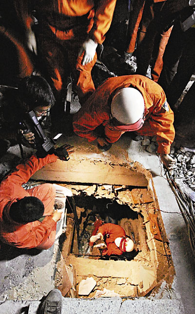 ■救援人員在廢墟上打開一個大洞準備將五層樓板下的傷員救出。由於缺乏裝備和餘震干擾,這個洞艱難地打了三天三夜。 本報記者 攝