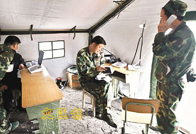 ■地震發生以後,救援部隊使用衛星電話向外界傳遞信息。 資料圖片