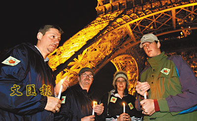 ■幾名遊客在巴黎埃菲爾鐵塔腳下為中國地震災區祈禱。 新華社