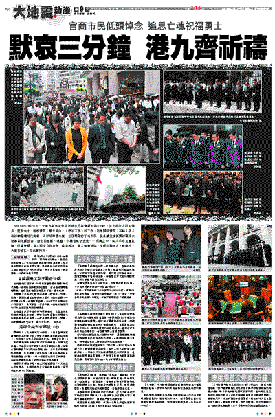 平素熱鬧緊張的港交所忽然安靜肅穆,金銀業貿易場,乃至於本港多家銀行都暫停服務3分鐘;港鐵全線列車於下午2時28分響號10秒;尖沙咀天星碼頭船隻鳴笛、巴士響號,金珠船務、珠江客運及愉景灣航運響號1分鐘……每一個從沒先例可言的舉措,訴說著同樣的傷痛:向四川地震死難者誌哀。