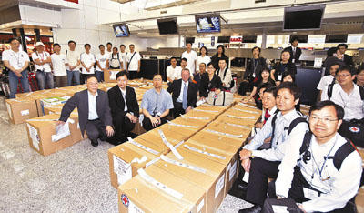 ■醫管局昨早再派第二批15人的醫療隊由劉楚釗率領前往災區,協助當地工作。醫管局質素及安全總監梁柏賢、蘇利民等到場打氣,其餘為出發的醫療隊員。 本報記者 潘達文 攝