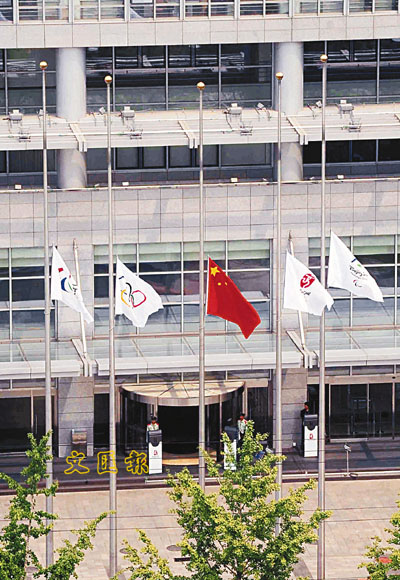 ■奧組委所在地北京奧運大廈降半旗,哀悼在汶川大地震中的遇難者。 新華社