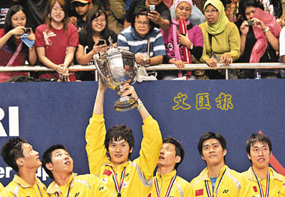 ■中國羽隊隊員鮑春來舉起湯姆斯盃。 新華社