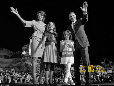 ■奧巴馬一家人站在艾奧瓦州講台上,感謝選民熱情支持。 法新社