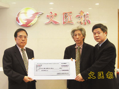 ■晉利金融地產有限公司代表王樹源及趙楚華,向本報賑災基金捐出1,080,020元,由副社長潘一黎接收。 本報記者李永青 攝