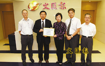 【本報訊】(記者 陳倩筠)繼本月15日向文匯報賑災基金專戶捐贈50萬港元後,香島教育機構屬下各校近日再籌得近73萬元送交紅十字會,香島教育基金則以配對形式撥出73萬元,昨再次委託本報賑災基金專戶,將善款轉送至災區。香島中學副校長葉燕平、天水圍香島中學校長楊耀忠、將軍澳香島中學校長吳容輝及香島教育基金董事王志華,昨日將基金配對所得的73萬元善款交予文匯報賑災基金,由本報副社長韓力代表接收支票。