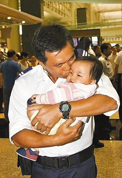 ■已任職消防員17年的鄭國柱,一踏出禁區即緊緊抱著才9個月大的小女兒,場面感人。本報記者彭子文 攝