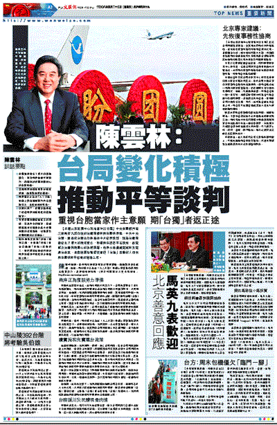 陳雲林強調,當前兩岸關係呈現良好發展勢頭,面臨難得重要機遇。他說,兩岸雙方正為在「九二共識」基礎上恢復協商談判作出積極努力,並展開相關準備。(陳雲林談話全文見本報網頁:http://www.wenweipo.com)