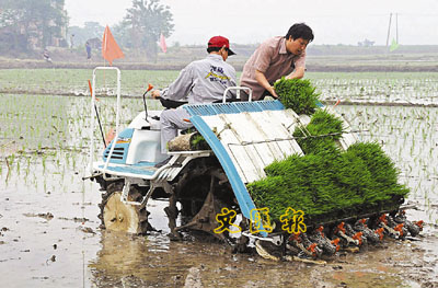 23日,湖北省當陽市12名農民成立了水稻機械插秧合作社,為當地農民提供機械插秧服務,以提高效率。新華社