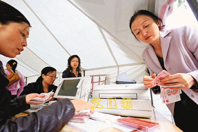 ■銀監會昨於網站發出通知,要求各銀行業金融機構認真做好汶川大地震造成的銀行業呆帳核銷工作,努力減輕受災地區人民群眾的債務負擔。圖為5月19日,中國農業銀行理縣支行設置的首個災區帳篷銀行開始營業。新華社