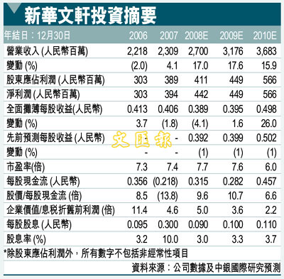 新華文軒(0811)透露,5月12日汶川大地震對公司財政影響不會太大,經濟損失不會超過總收入的1%。我們保守將08、09年經常性利潤預測分別下調1%至4.42億人民幣 (每股收益:0.389元人民幣)和4.49億人民幣 (每股收益:0.395元人民幣)。我們預計資產和庫存沖減及賑災捐款造成約3,000萬人民幣特殊項目虧損。維持對該股優於大市的評級。目標價為8.1元(昨收3.23元)。