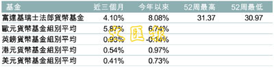 受惠匯兌升值,富達基瑞士法郎貨幣基金今年以來已上升了8%,而近一年以來的收益也接近18%。基金主要投資於以瑞士法郎結算的債務證券及其它獲准的資產。資產百分比為100%現金。基金在2005、2006和2007年表現分別為—13.64%、8.17%及8.97%,基金標準差為8.93。