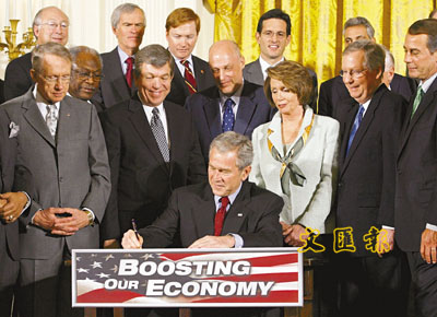 ■美國經濟轉弱,今年2月布什在國會簽署千億美元刺激經濟方案。資料圖片