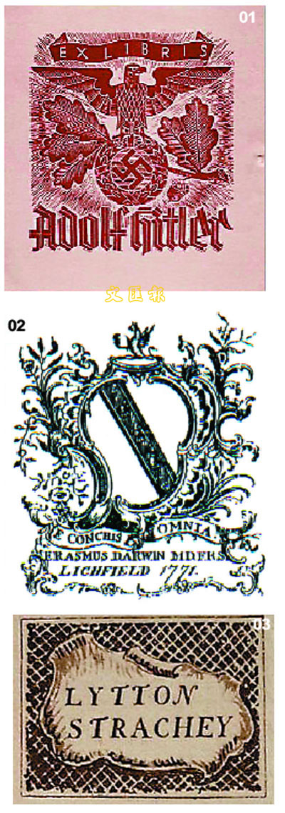 01 Dora Carrington在1931年為Lytton Strachey設計的藏書標籤(高1 3/8英寸、 闊1 3/4英寸),約值400美元。/02 阿道夫.希特勒的藏書標籤(高103mm、闊91mm),約值80美元。/03 達爾文的1771年設計的藏書標籤,標籤中加有「E conchis omnia」(意謂一切由貝類開始),印證他對進化論的信念。