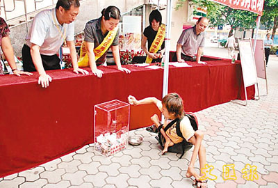 5月15日12時,南京市江寧區東新南路的一個募捐點。一位60多歲的老人慢慢走來。他頭髮花白,藍褂子的下襬已經破爛,胸前背後打滿了補丁,腳上穿一雙舊涼鞋,手中還拿著一隻討飯碗。老人端著碗,在募捐宣傳牌前看了一會兒,哆哆嗦嗦拿出5元錢放進捐款箱。工作人員愣住了,「他步履蹣跚,看著他的背影,我忍不住想哭。」