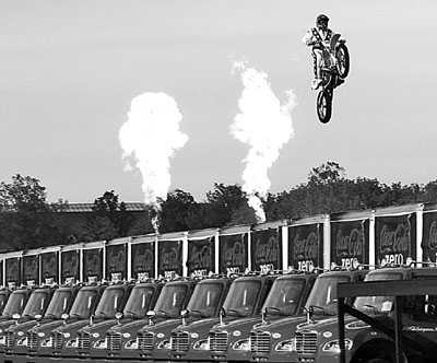 美國亡命飛車王克尼維爾前日在美國辛辛那提附近一個遊樂園再作另一創舉,他成功騎電單車飛越24輛橫排長達61米的貨車(見圖)。