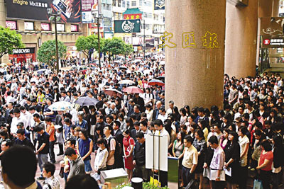 ■5月19日下午2點28分,香港時代廣場眾多市民停住匆忙的腳步,為四川汶川大地震遇難同胞低頭默哀3分鐘。