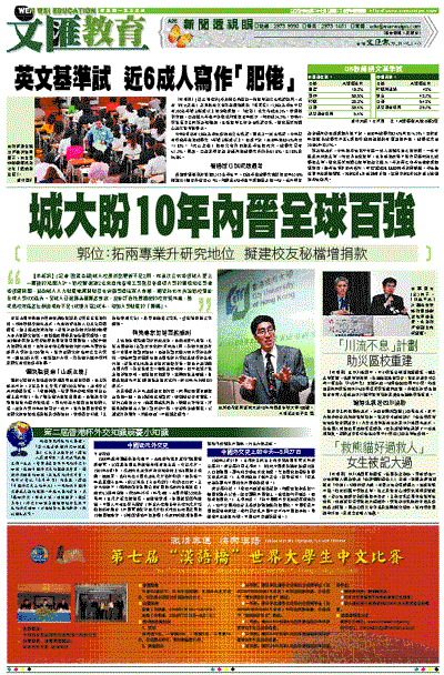 【本報訊】(記者 歐陽杏櫻)城大校長郭位履新不足2周,昨首次公布帶領城大更上一層樓的鴻圖大計。該校擬邀請2名來自麻省理工學院及華盛頓大學的國際知名學者帶領顧問團,協助城大大力發展能源開發及生命醫學環境兩大專業,期望於10年內讓該校晉身全球大學100強內。另城大已邀得美國籌款專家,度身訂造性質機密的校友資料庫,務求把校友捐款比例由現時不足1成提升至2成半,增加大學發展的「籌碼」。