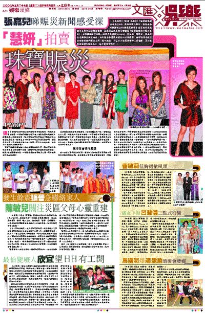 【本報訊】(記者 李慶全)「慧妍雅集慈善晚會2008」將於本周六舉行,慶祝香港成為協辦2008奧運馬術項目及當晚亦會義賣廿五周年紀念冊及郵票,籌得的善款將會全數撥捐「慧妍雅集四川賑災基金」。主席楊婉儀昨日與一班會員陳法蓉(Monica)、呂慧儀、張嘉兒、周美欣及朱凱婷出席記者會,其中陳法蓉透露有見四川災情嚴重,慧妍會將會捐款及拍賣珠寶作賑災之用,她不禁說:「這次大地震著實令人好難過,雪災後我曾到過內地當義工,這次更加要幫忙。」