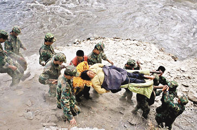■成都軍區駐渝某部官兵在搶運傷員。新華社