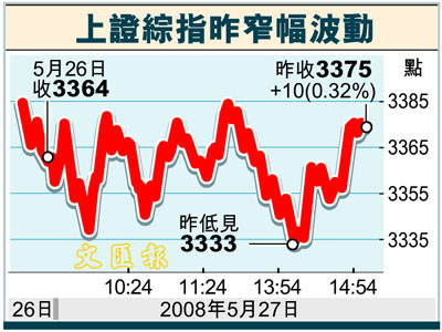 上證綜指今日窄幅震盪,收報3,375點,微漲0.32%。深證成指收報11,998點,漲0.91%。兩市總成交838億元,較昨日萎縮兩成。廣發證券研究員萬兵表示,成交量在近期逐日萎縮,市場觀望氣氛濃郁,由於機構投資者經過前期的減倉,目前倉位普遍較輕,因此大盤的壓力並不重,市場在災後再度進入信心恢復階段,近日的調整已較為充分,股指後市企穩回升的可能性較大。