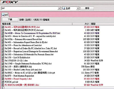 但昨日仍有警方內部文件在Foxy上被分享,本報記者昨日嘗試在Foxy內打上「POL」三字,即時找到數百個相關檔案,當中包括一宗懷疑遺失手提電話案件的詳細報告,報案人及一名涉案清潔女工的名字及身份證號碼亦一覽無遺。