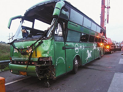 ■在深汕高速公路海門路段上昨凌晨發生車禍的大巴。
