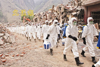 ■在重災區映秀鎮,為防止疫情爆發,有關部門開始捕殺家禽家畜。圖為搜救人員全副武裝。路透社