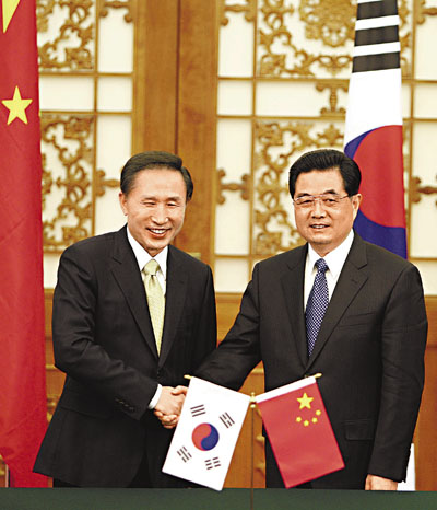 李明博表示,對華關係是韓國外交軸心之一。韓方高度重視進一步深化兩國關係,此次雙方同意將全面合作夥伴關係提升為戰略合作夥伴關係,將為兩國關係發展開闢廣闊前景。