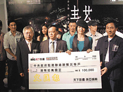 【本報訊】(記者 梁靜儀)電影《青苔》前晚舉行賑災慈善首映禮,出席的演員有余文樂、冼色麗、樊少皇及導演郭子健等,席上並由梁詠琪代表美亞娛樂捐十萬元,交給中聯辦作為四川賑災用途。