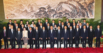 ■胡錦濤與吳伯雄率團的中國國民黨訪問團成員合照留念。 美聯社