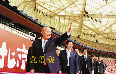 ■中國國民黨主席吳伯雄參觀北京奧運主體育場「鳥巢」,盛讚她是了不起的建築。中新社
