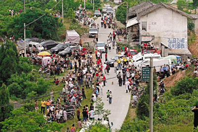 ■針對唐家山堰塞湖險情加劇,綿陽市出台潰壩緊急撤離預案。圖為綿陽西平鎮民眾聚集一起準備撤離。 法新社