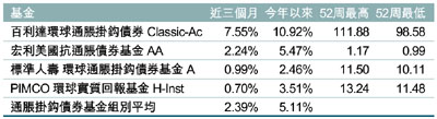 比如佔近三個月榜首的百利達環球通脹掛鉤債券基金,基金今年以來的漲幅已逾1成。基金在2007年表現分別為16.56%。資產百分比為92.45% 債券及7.55% 現金。基金主要透過投資於由各國政府、政府機構、超國家組織和公司發行,與通脹連繫的債券組合,以達致資本增長和收益。