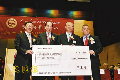 【本報訊】李東海藝術中心開幕典禮,日前假香港加拿大國際學校舉行,主辦單位邀得教育局局長孫明揚蒞臨主禮。開幕禮上,同時舉行揭幕及支票贈送儀式,由該校校董會主席李君豪、校長馬德偉接過李東海捐贈的1千萬元支票。