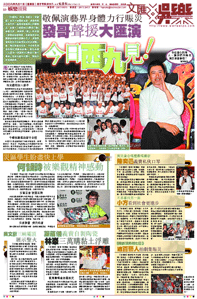【本報訊】(記者 李慶全、梁靜儀)四川大地震發生後,演藝界與全港市民一樣積極捐獻同心抗震救災,發動了「演藝界512關愛行動」情繫災民,與眾同「諾」。早前藝人參與的街頭籌款,各間電視台或團體搞的賑災活動已不少,演藝界首批赴四川災區探訪災民及醫護人員、救災英雄也完成,今日將是演藝界賑災活動的高潮—集亞洲藝人力量的「演藝界512關愛行動大匯演」在西九龍中天舉行,歡迎市民到場參與。