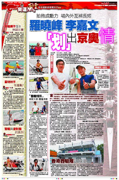 當年本港風帆界有李麗珊及黃德森成體壇「金童玉女」,近年則有陳慧琪及何智豪成「風帆情侶」,雖然後者未能達成共征京奧的心願,不過其好友羅曉峰及李嘉文今屆將以「賽艇情侶」身份,代友首次攜手出戰京奧,兩人更異口同聲盼於京奧贏盡亞洲對手,為香港賽艇界創下光輝新一頁。