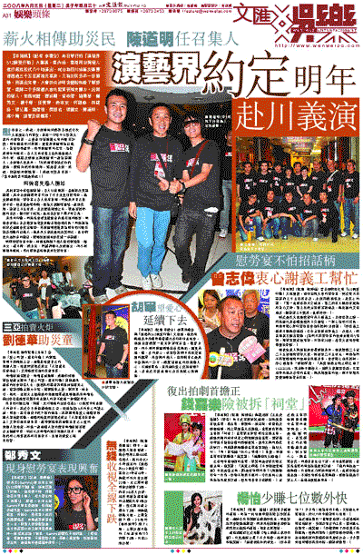 未來的行動,阿倫指會看怎樣配合內地災區的需要。問到會否擔心善款轉買物資後未能善用救濟災民?阿倫認為政府於這面會作出監管。另陳道明獲推舉為明年四川賑災籌款活動的召集人,他表示大家也是開玩笑而已,且目前也只是初步的擬定,還需要經過開會作進一步籌組。