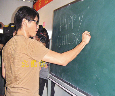 在臨時搭建的教室後,陶吉吉和孩子們一起合唱兒歌《兩隻老虎》,還教小朋友打節奏,唱和聲,告訴他們一邊拍課桌,一邊跟著他唱「we will,we will rock you,rock you」。由於鄰近六一國際兒童節,陶吉吉還特別用英文教小朋友「HAPPY CHILDREN's DAY」怎麼讀和寫。當聽到小朋友們大聲的讀出來後,陶吉吉也欣慰的對大家說:「Children's Day就是六一兒童節,就是你們馬上就要過的一個節日了,所以你們一定要節日快樂,更重要的是一定要每天都快樂。」