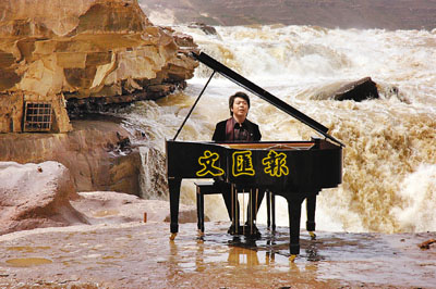 而電影中的重達480多公斤的鋼琴,價值150多萬元人民幣,運送成了劇組最大的難題,由於拍攝的場地包括長城2公里崎嶇的台階(上圖)、太行山艱險的山路、壺口瀑布邊(下圖)邁腳就陷下去的泥濘,在沒有任何輔助設備和器材的幫助下,全部要靠人力運送鋼琴到拍攝點,一步一挪的搬運鋼琴。