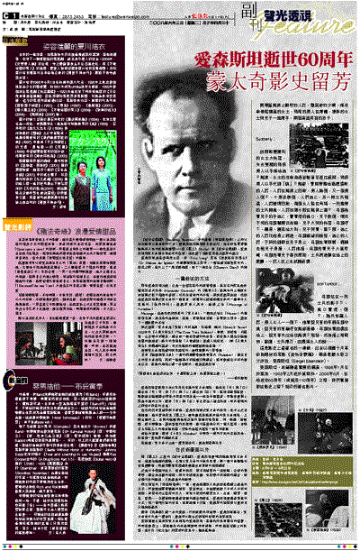 從劇場便已在研究蒙太奇理論的愛森斯坦,在國內外享有極高的聲譽,然而在創作上,卻因國內的政治局勢而時有限制。然而他在電影上的探索,在今次「紀念祭」所選映的作品中,都表露無遺。